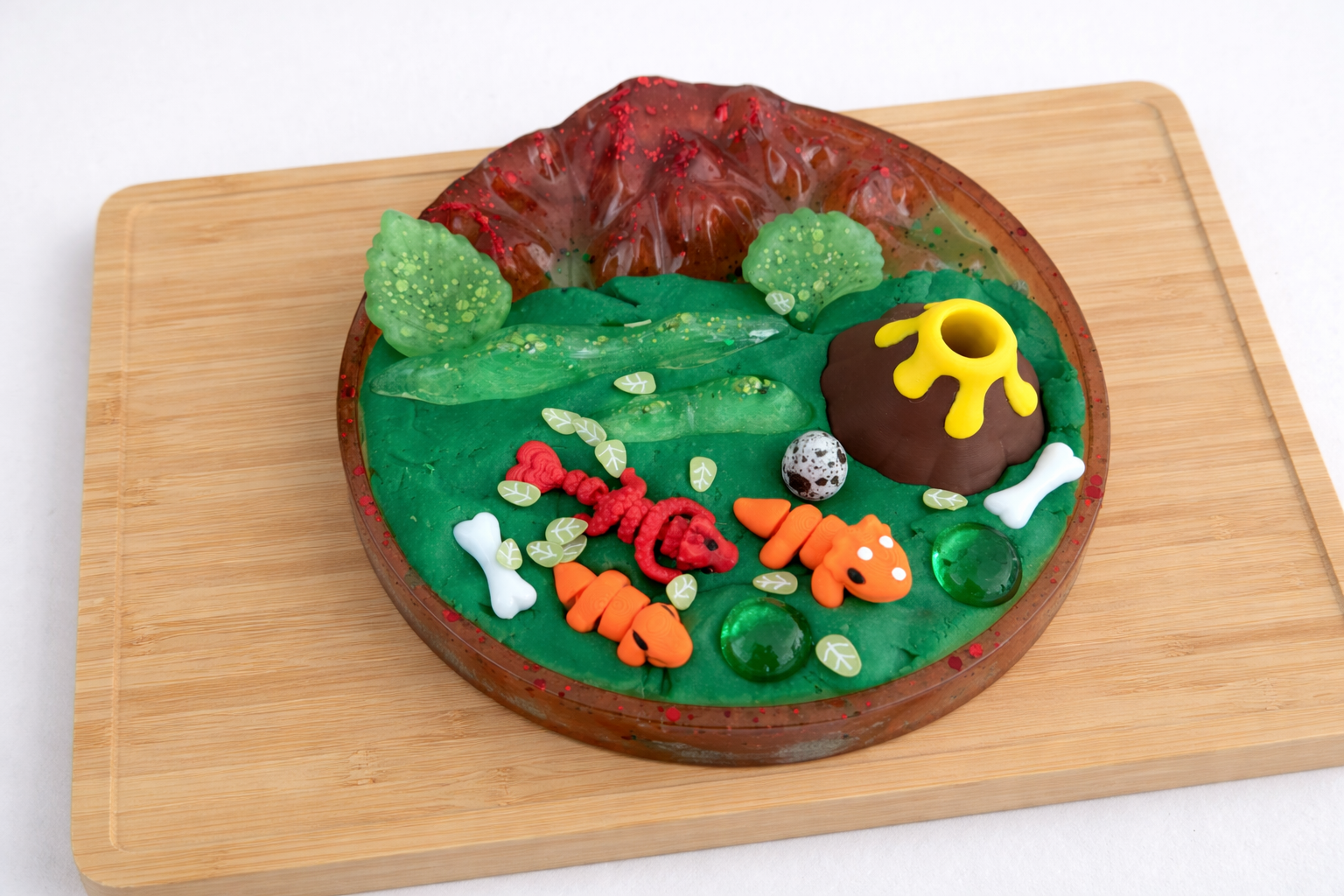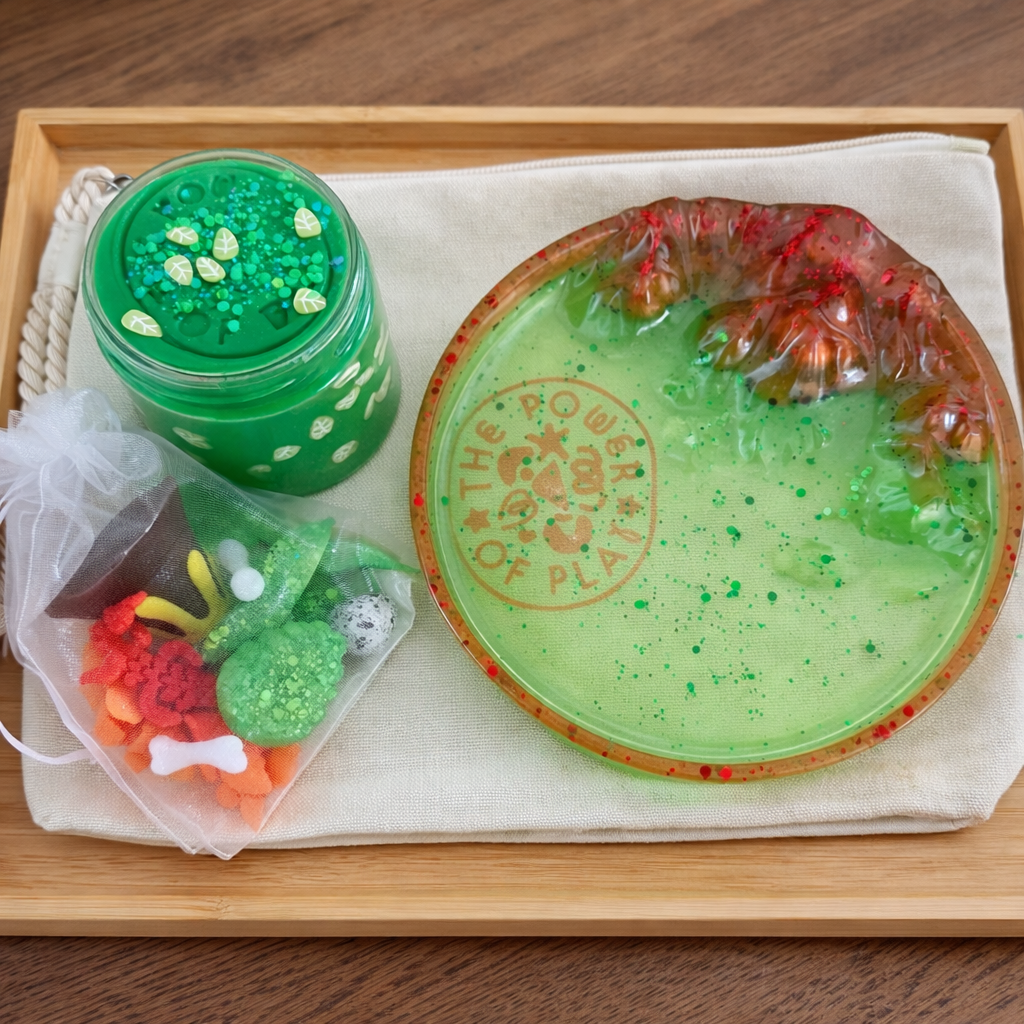 This hand-poured resin PlayScape features a beautifully detailed base, designed for open-ended sensory play. Paired with 280g of all-natural Playdough, children can create, dig, build, and explore their very own Jurassic land.